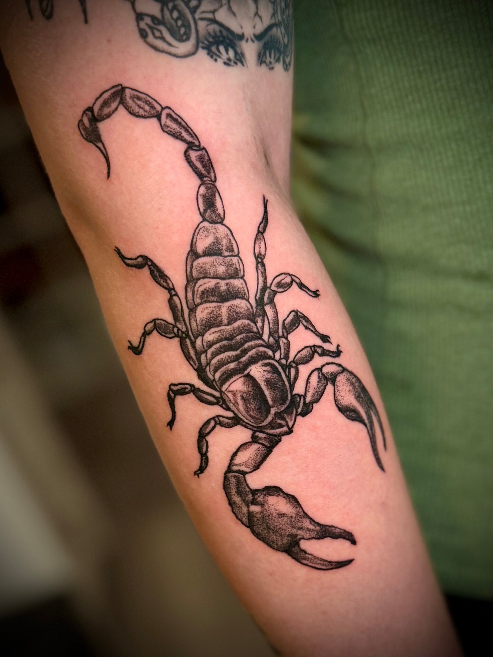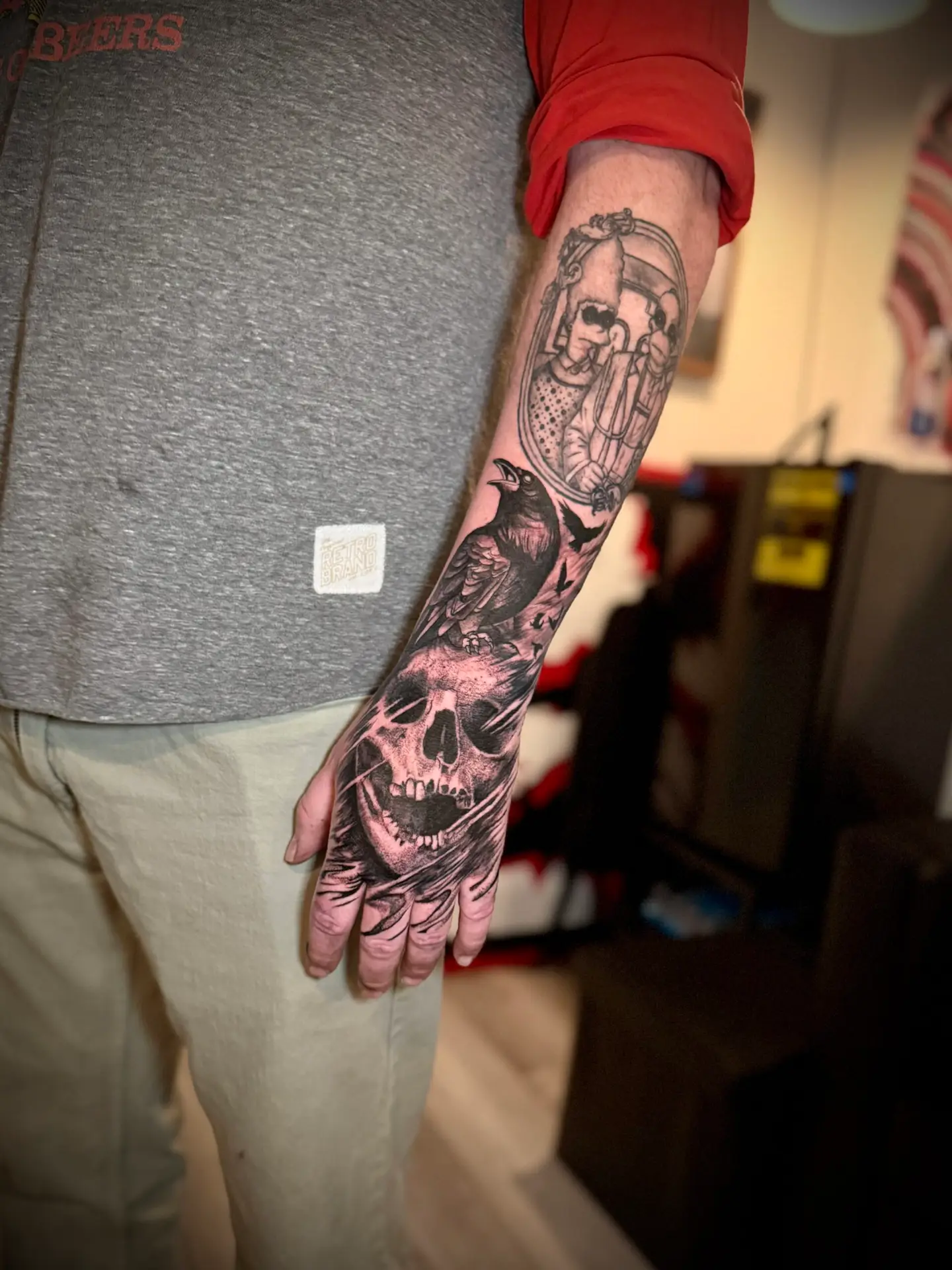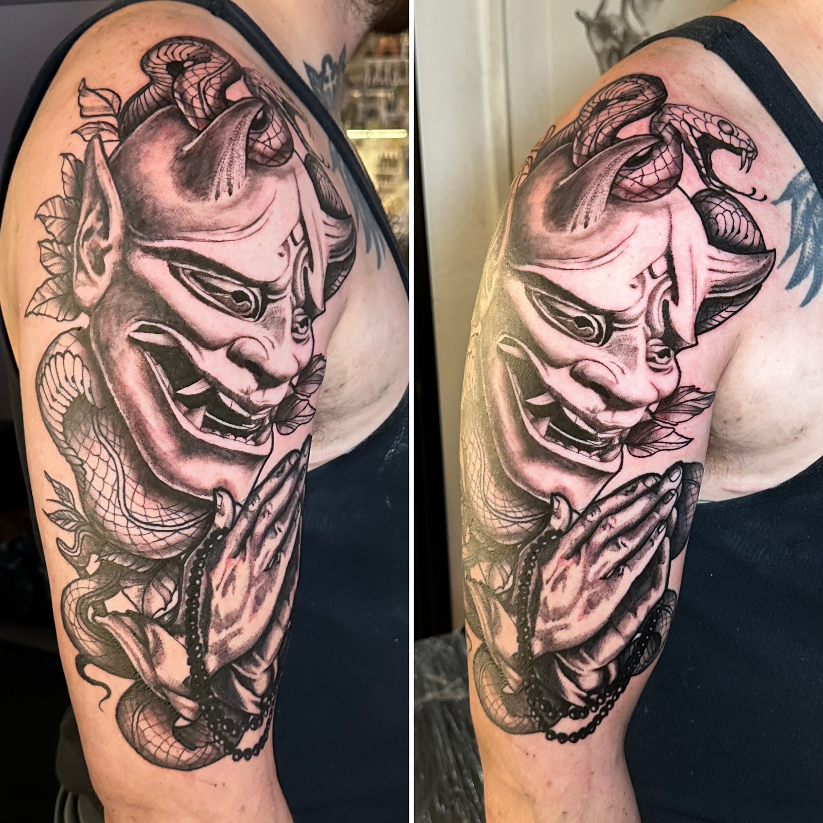 I use a balance of bold blacks, soft greys, pepper shading, and breathable negative space to build depth without losing clarity. Every piece is built to read from across the room, but still reward you with detail up close. I like when tattoos have a pulse — when the lines aren’t machine-perfect, but human and intentional.